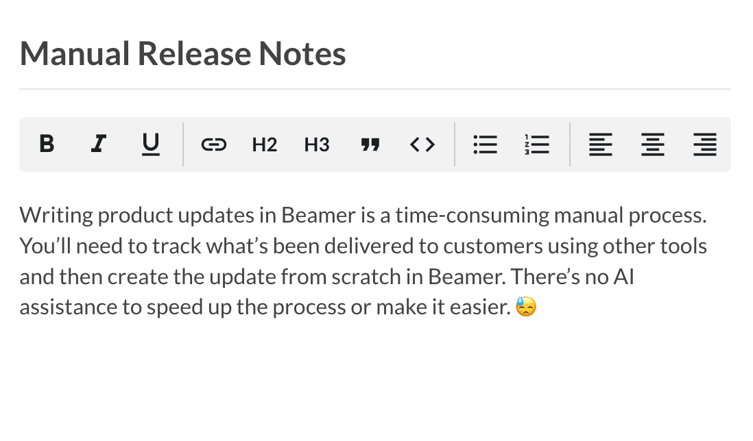 Product release notes are Beamer's bread and butter. Which makes it so much more surprising that the process of writing release notes remains largely manual, with zero AI assistance.