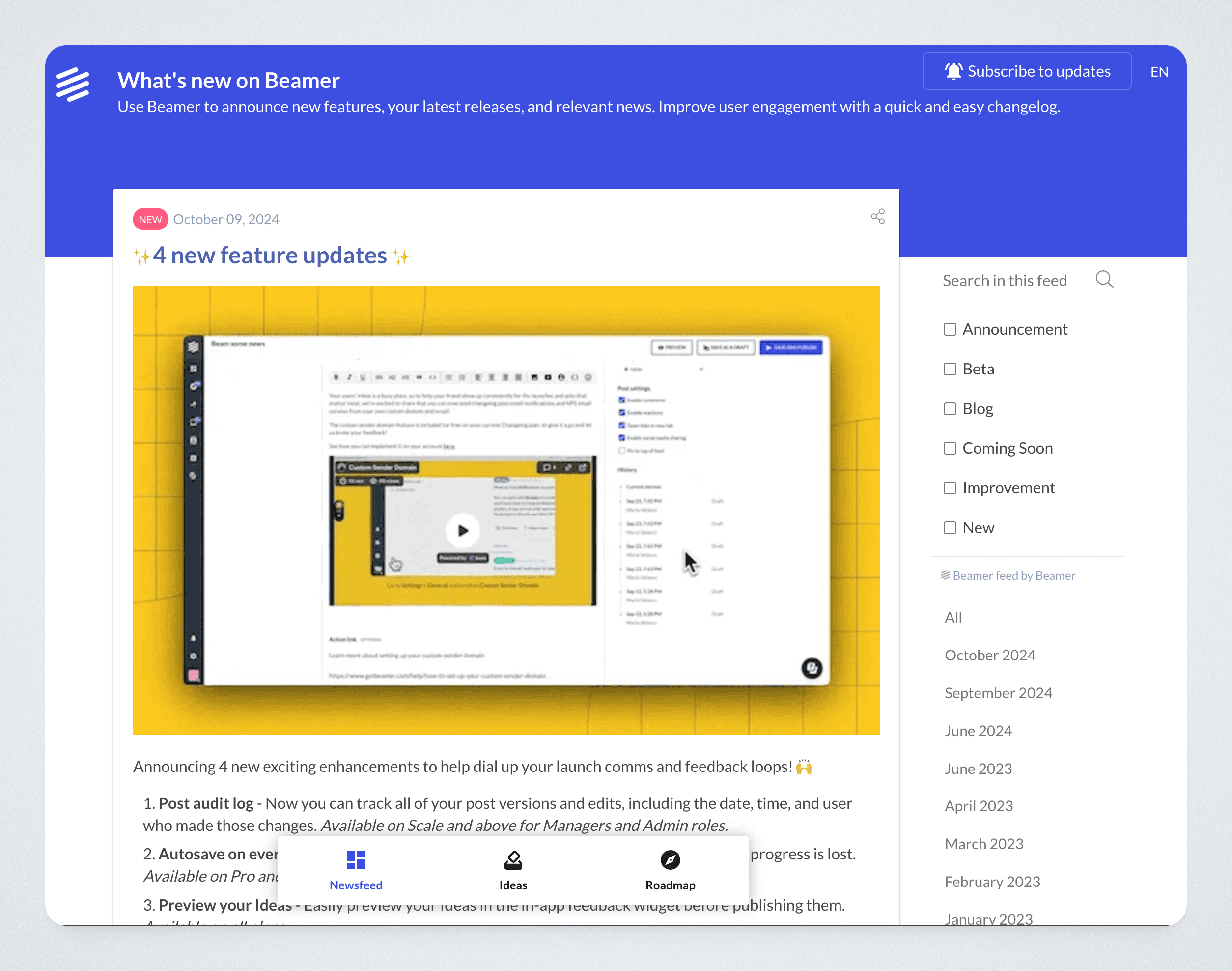 Full page changelog widget. Embed a full page changelog directly in your website or app.