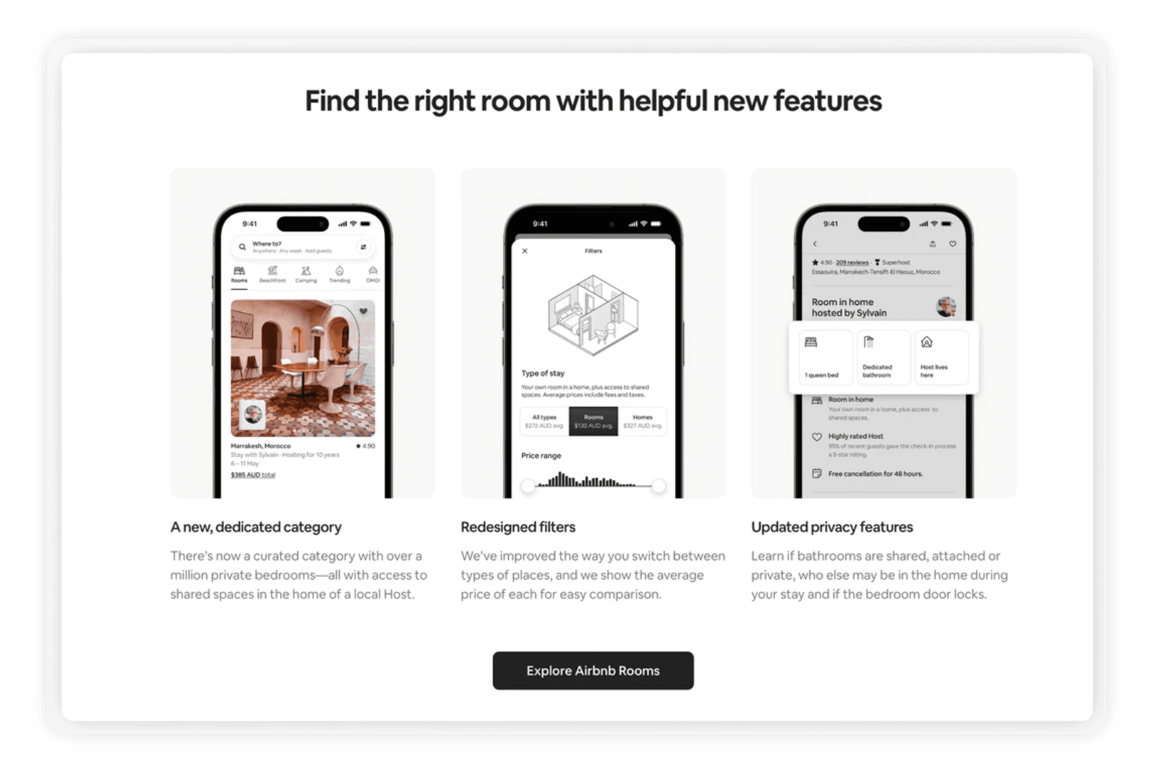 In lieu of the granular approach, Airbnb places emphasis on biannual "big bang" release announcements. These announcements arrive in the form of a meticulously crafted product releases section on their website, showcasing pivotal enhancements that enrich the host and guest experiences. The result is a visually captivating display of progress that resonates with their user base.