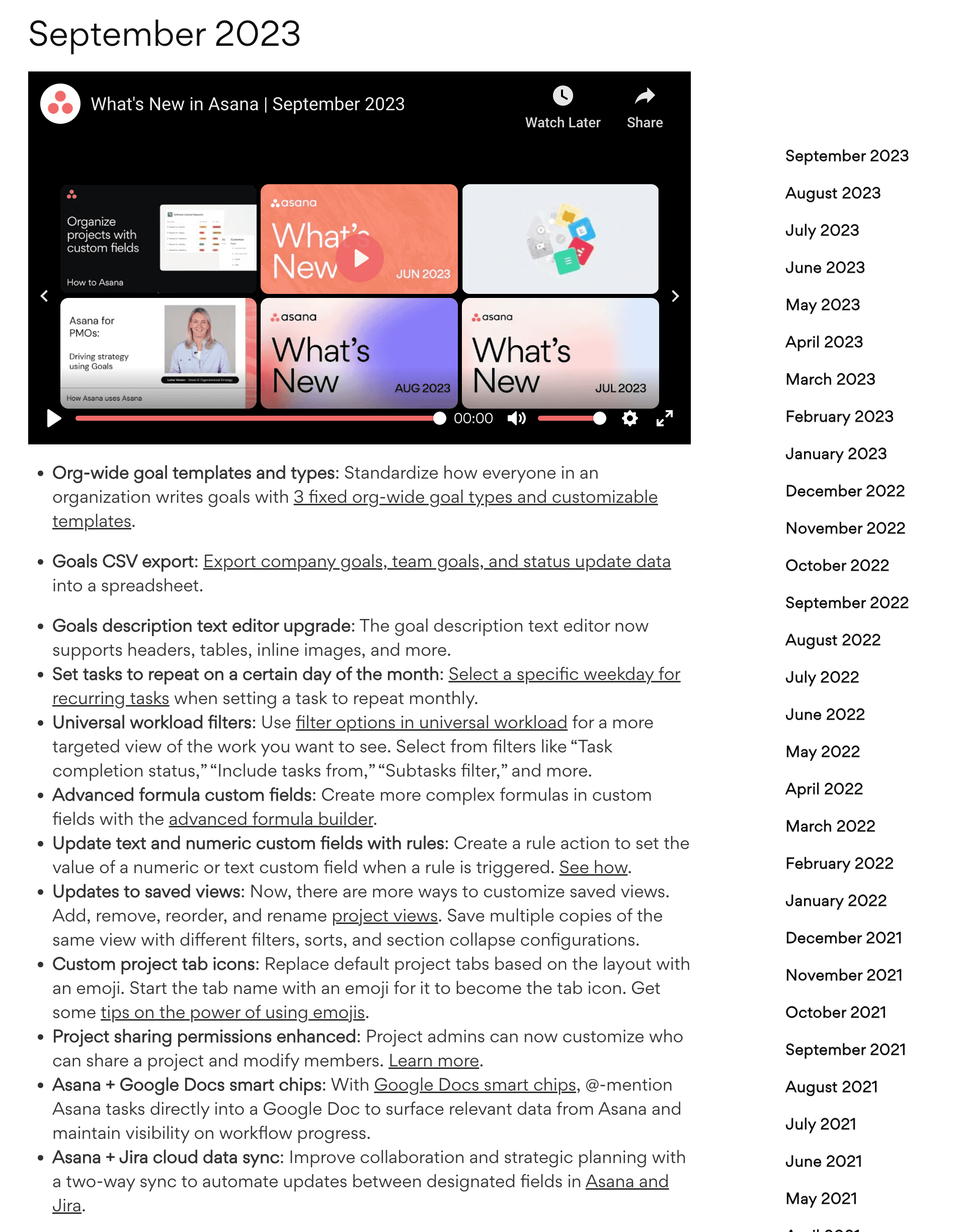 Asana keep their release notes simple with a basic bullet list of updates and improvements. Each update contains a link leading to a blog post or documentation where the feature is described in more detail. Instead of images to accompany the feature description, they decided to include a minute long video showcasing the one or two top features for the month.