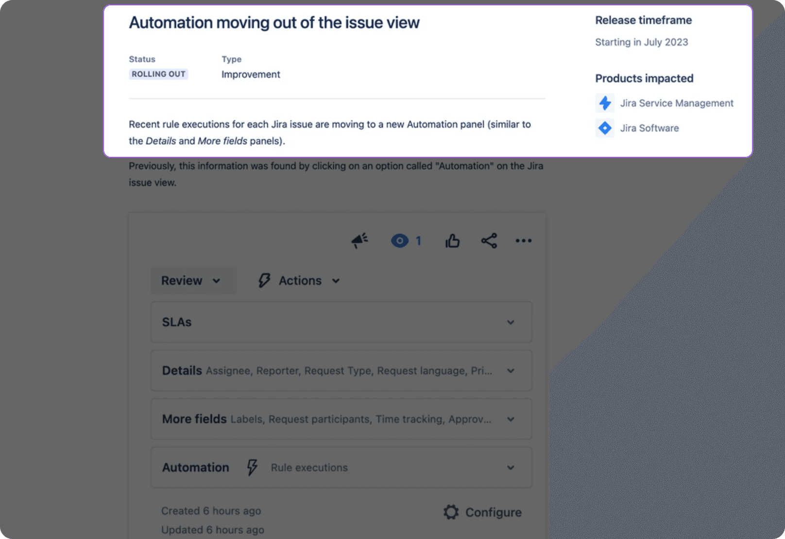 Recent rule executions for each Jira issue are moving to a new Automation panel (similar to the Details and More fields panels).